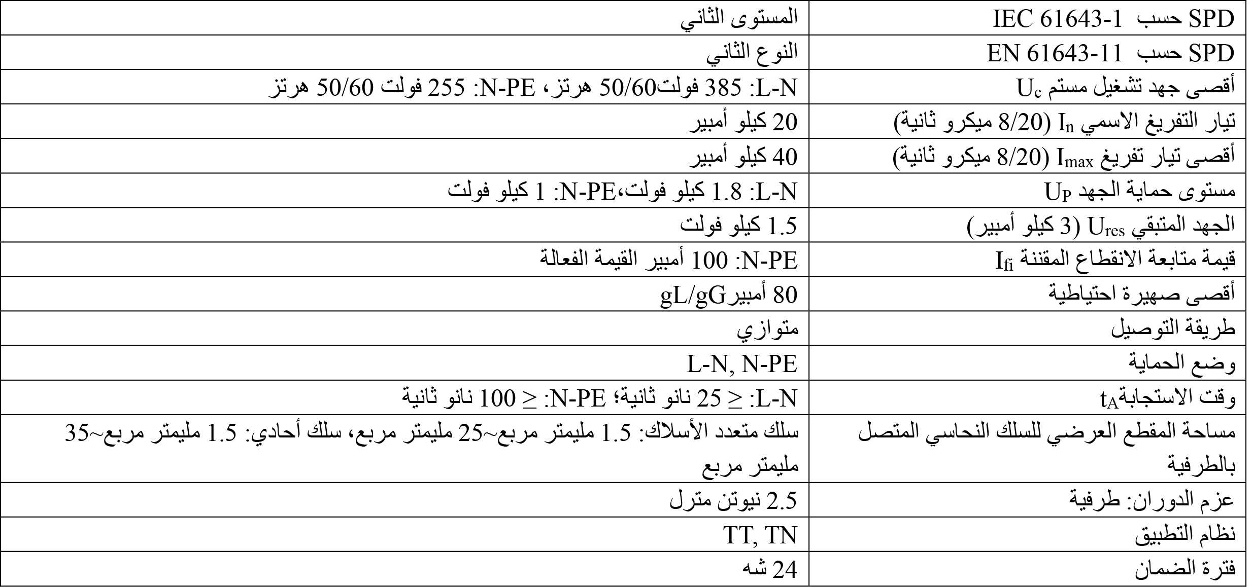 معايير التنفيذ IEC 61643-11: 2011; EN 61643-11: 2012; UL 1449 Ed.4