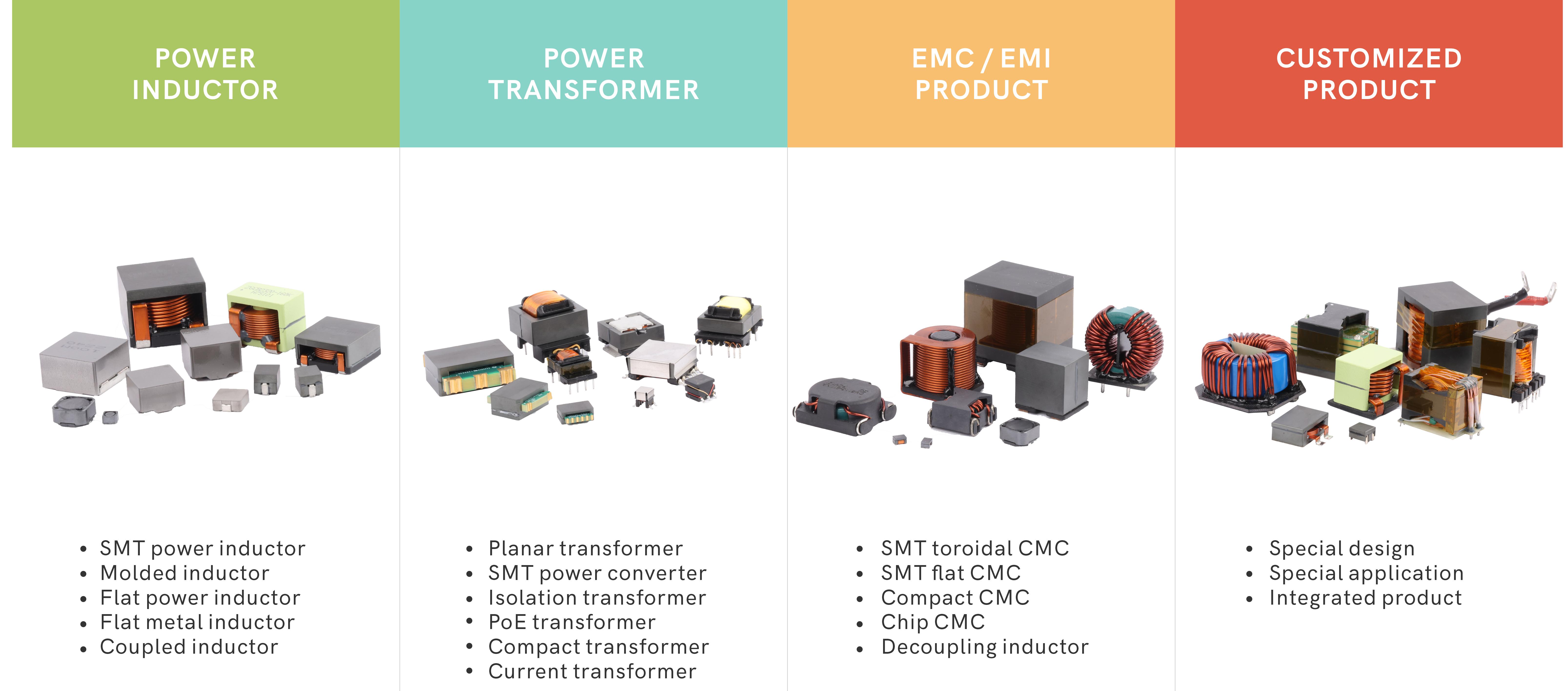 تمتلك Zhongguang مجموعة استثنائية واسعة من المكونات المغناطيسية التي تغطي مجال تطبيقات أنظمة الطاقة الإلكترونية بالكامل - على سبيل المثال، إمدادات الطاقة AC/DC، محولات DC/DC، إمدادات الطاقة الثانوية المختلفة، ووحدات الطاقة. تتضمن الصناعات التطبيقية الرئيسية السيارات، الاتصالات السلكية واللاسلكية، الصناعة، التكنولوجيا الطبية، الطاقة المتجددة، وكذلك السكك الحديدية.