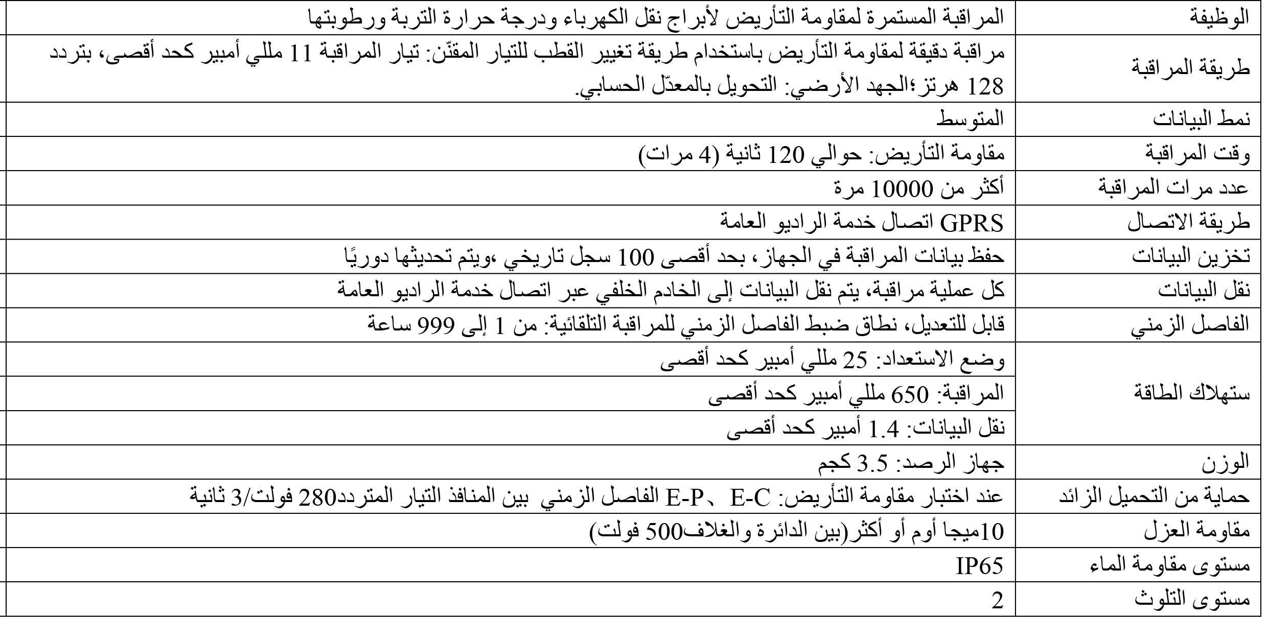 يمكن استخدامه على أبراج نقل الكهرباء والاتصالات، حيث يقوم بمراقبة مقاومة التأريض ودرجة حرارة ورطوبة التربة تلقائيًا عبر الإنترنت، مع ارسال البيانات إلى الخادم الخلفي عبر اتصال خدمة الراديو العامة ، مع إمكانية ضبط وقت وتردد المراقبة حسب متطلبات العميل.
