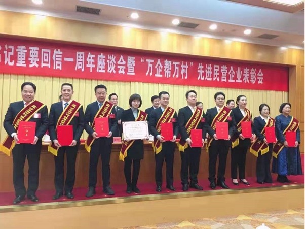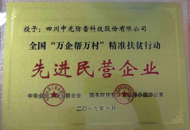 为深入贯彻落实习近平总书记的重要回信精神,表彰先进、树立典型,激励广大民营企业更加踊跃更加高效参与脱贫攻坚战,全国“万企帮万村”行动领导小组于近日在北京召开“贯彻落实习近平总书记重要回信一周年座谈会暨“万企帮万村”先进民营企业表彰会”。在会上,四川中光防雷科技股份有限公司等99家民营企业被授予——全国“万企帮万村”精准扶贫行动先进民营企业。