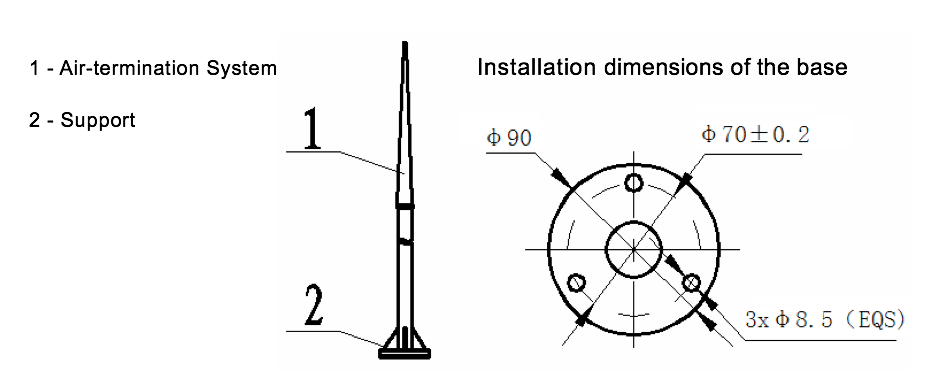 Dispositivo compacto para protección contra rayos directos, con funciones de intercepción y derivación de corriente del rayo a tierra por el conductor de bajada. Ligero y de fácil instalación. Adecuado para la protección contra rayos directos en estaciones base, equipos de comunicación y edificaciones pequeñas.