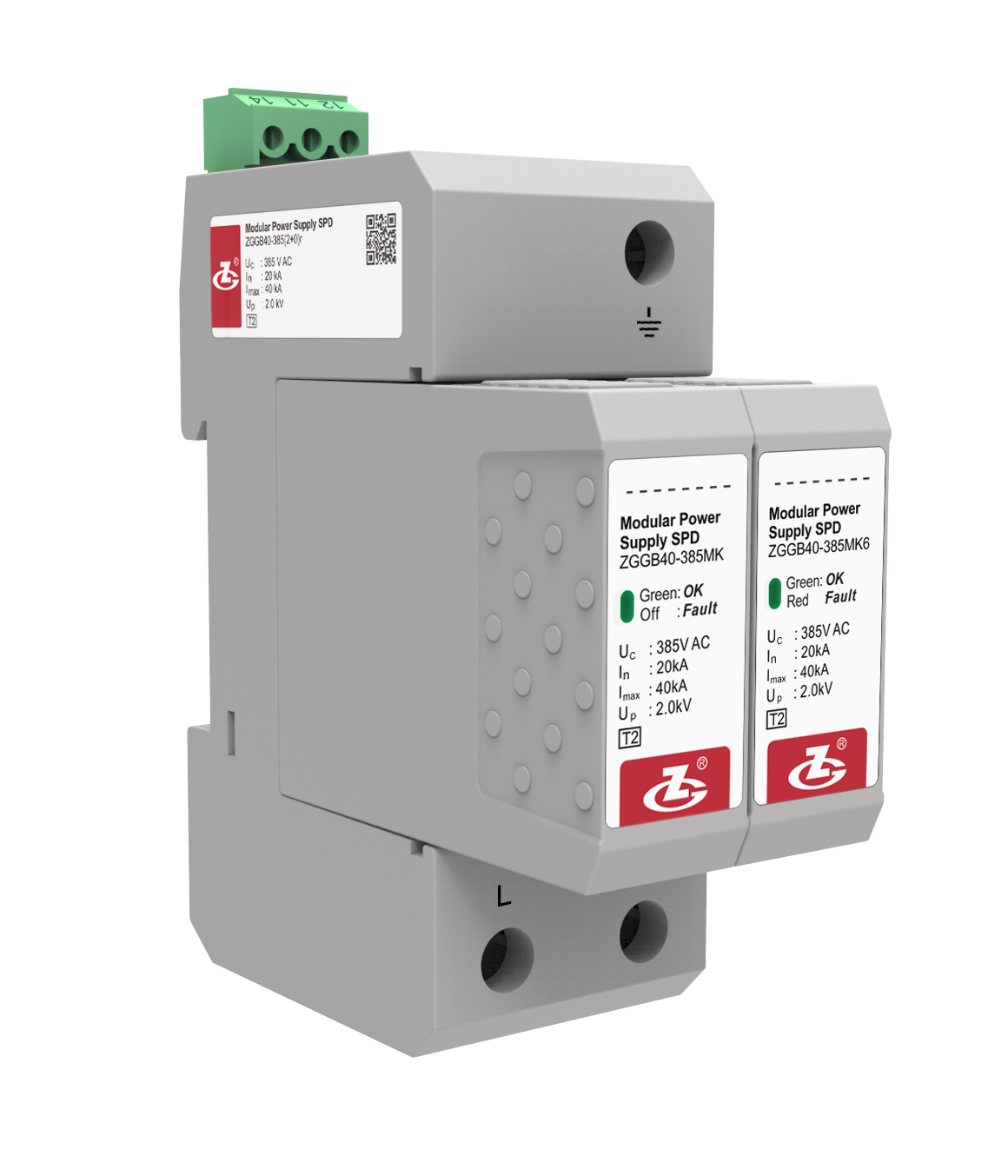 ZGGB40-385(2+0) 금속산화물바리스터(MOV)형 전원 모듈 베이스로 구성되며, 각각 L-N, N-PE 간의 Class 2 보호에 사용됩니다. 본 전원 모듈 서지보호장치는 내장형 퓨즈를 탑재하고 있어 별도의 외부 백업 퓨즈 없이 설치 가능하며, 공간을 절약할 수 있습니다.